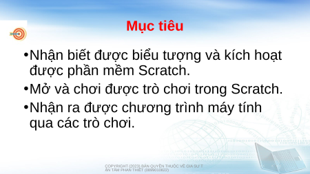 •Nhận biết được biểu tượng và kích hoạt được phần mềm Scratch.