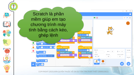 COPYRIGHT (2023) BẢN QUYỀN THUỘC VỀ GIA SƯ TẬN TÂM PHAN THIẾT (0899010822) Scratch là phần mềm giúp em tạo chương trình máy tính bằng cách kéo, ghép lệnh