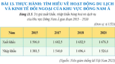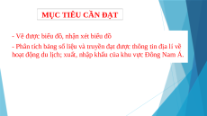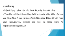 hoạt động du lịch; xuất, nhập khẩu của khu vực Đông Nam Á. NỘI DUNG THỰC HÀNH 2. Hoạt động xuất 1. Hoạt động du lịch khẩu, nhập khẩu Tính tốc độ Vẽ biểu đồ thể Nhận xét, Truyền đạt tăng số lượt hiện trị giá phân tích và thông tin về khách du lịch xuất khẩu, truyền đạt hoạt động du quốc tế đến và nhập khẩu thông tin về lịch của khu hàng hoá và hoạt động xuất doanh thu du vực Đông dịch vụ của khẩu, nhập lịch khu vực Nam Á. ĐNA giai đoạn khẩu của khu Đông Nam Á 2015 – 2020. vực ĐNA. CHUẨN BỊ