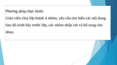 Giáo viên chia lớp thành 4 nhóm, yêu cầu tìm hiểu các nội dung.