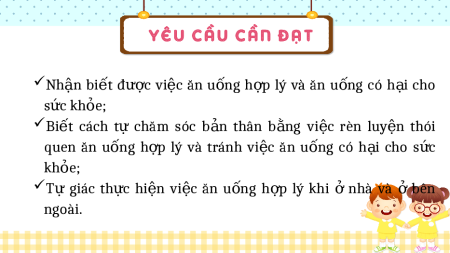 Cùng hát nào! Nh n ậ bi t ế đ c ượ vi c ệ ăn u ng ố h p ợ lý và ăn u ng ố có h i ạ cho s c ứ kh e ỏ ; Bi t ế cách t ự chăm sóc b n ả thân b ng ằ vi c ệ rèn luy n ệ thói quen ăn u ng ố h p ợ lý và tránh vi c ệ ăn u ng ố có h i ạ cho s c ứ kh e ỏ ; Tự giác th c ự hi n ệ vi c ệ ăn u ng ố h p ợ lý khi ở nhà và ở bên ngoài.