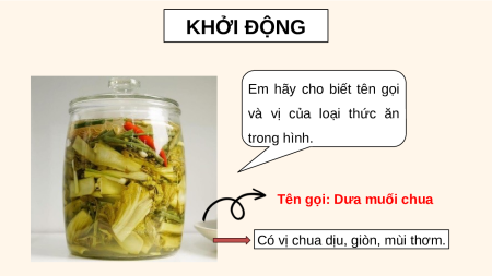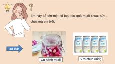 Em hãy kể tên một số loại rau quả muối chua, sữa chua mà em biết. Trả lời: Củ hành muối Sữa chua uống BÀI 13