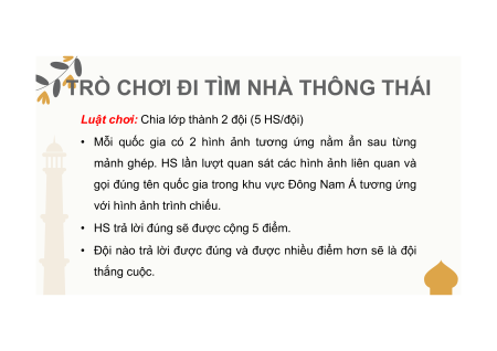 TRÒ CHƠI ĐI TÌM NHÀ THÔNG THÁI Câu 1 BRU-NÂY