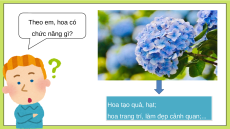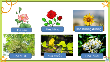 cho biết tên cây có hoa tương ứng đó. Hoa hồng Hoa hướng dương Hoa sen Hoa đu đủ Hoa mướp Hoa bưởi Theo em, hoa có chức năng gì? Hoa tạo quả, hạt;