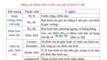 Bảng các thuộc tính cơ bản của một số hình có sẵn