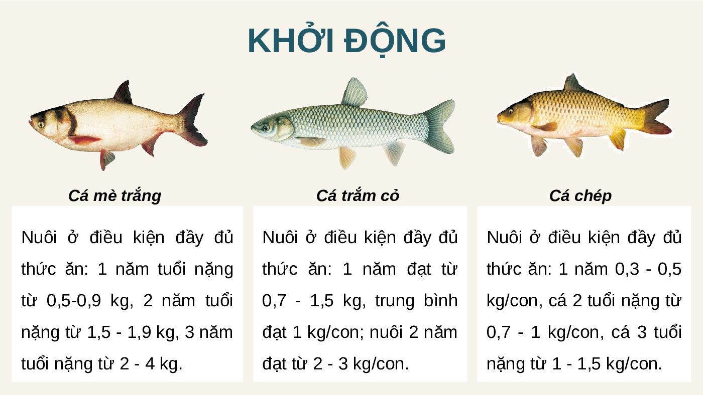 nặng từ 1,5 - 1,9 kg, 3 năm đạt 1 kg/con; nuôi 2 năm 0,7 - 1 kg/con, cá 3 tuổi tuổi nặng từ 2 - 4 kg. đạt từ 2 - 3 kg/con. nặng từ 1 - 1,5 kg/con. KHỞI ĐỘNG Cá mè trắng Cá trắm cỏ Cá chép