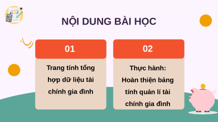 gia đình hiệu quả, bảng tính cần bổ sung thông tin gì? BÀI 13A: HOÀN THIỆN BẢNG TÍNH QUẢN LÍ TÀI CHÍNH GIA ĐÌNH NỘI DUNG BÀI HỌC 01 02 Trang tính tổng Thực hành: hợp dữ liệu tài Hoàn thiện bảng chính gia đình tính quản lí tài chính gia đình