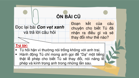 Đọc lại bài Con vẹt xanh chuyện cho biết Tú đã và trả lời câu hỏi nhận ra điều gì và sẽ thay đổi như thế nào? Trả lời: