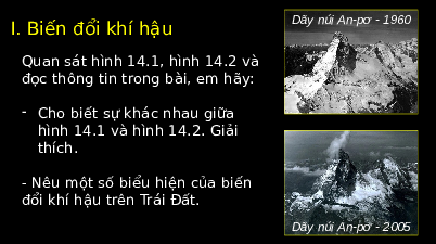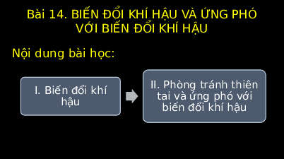 Bài 14. BIẾN ĐỔI KHÍ HẬU VÀ ỨNG PHÓ VỚI BIẾN ĐỔI KHÍ HẬU Nội dung bài học: I. Biến đổi khí II. Phòng tránh thiên hậu tai và ứng phó với biến đổi khí hậu