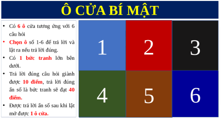• Có 6 ô cửa tương ứng với 6 câu hỏi