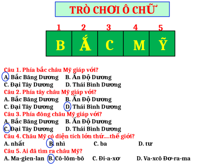 ự vào Tập bản đồ Đ a ị lí 7 và ki n ế th c ứ đã h c ọ đ ể tr ả l i, ờ m i câu ỗ h i c ỏ ó 1 lư t tr ợ ả lời. - Em nào tr ả l i ờ đúng sẽ nh n ậ đư c ợ 1 ph n ầ quà nh ỏ và ô ch ữ sẽ hi n r ệ a ch cái t ữ ư ng ơ ng ứ , tr l ả i sai ô ch ờ sẽ ữ b k ị hóa l i ạ . - Trong quá trình tr ả l i, ờ em nào tr ả l i ờ đúng tên t ừ khóa thì sẽ nhận đư c p ợ hần quà l n h ớ n ơ . TRÒ CH I Ơ Ô CHỮ 1 2 3 4 5 B Ă Ắ C M Y Ỹ Câu 1. Phía b c