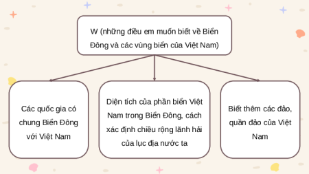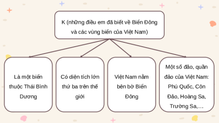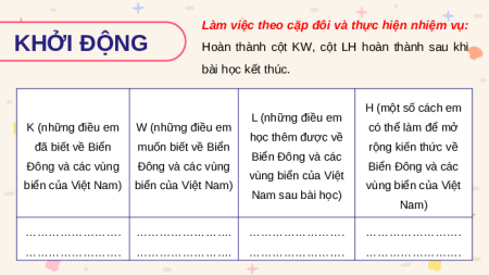 Hoàn thành cột KW, cột LH hoàn thành sau khi bài học kết thúc. H (một số cách em L (những điều em K (những điều em W (những điều em có thể làm để mở học thêm được về đã biết về Biển muốn biết về Biển rộng kiến thức về Biển Đông và các Đông và các vùng Đông và các vùng Biển Đông và các vùng biển của Việt