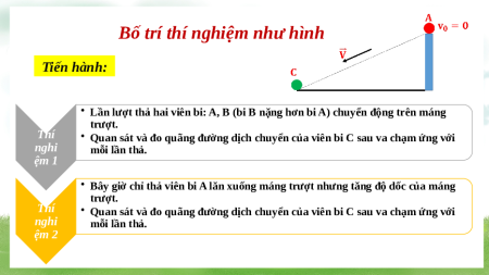 • Lần lượt thả hai viên bi: A, B (bi B nặng hơn bi A) chuyển động trên máng trượt. Thí