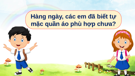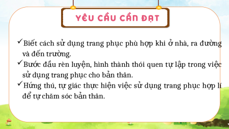 Bi t ế cách s ử d ng ụ trang ph c ụ phù h p ợ khi ở nhà, ra đ ng ườ và đ n tr ế ư ng. ờ Bước đ u ầ rèn luy n, ệ hình thành thói quen t ự l p ậ trong vi c ệ s d ử ng t ụ rang ph c ụ cho b n t ả hân. H ng ứ thú, t ự giác th c ự hi n ệ vi c ệ s ử d ng ụ trang ph c ụ h p ợ lí đ t ể c ự hăm sóc b n t ả hân.