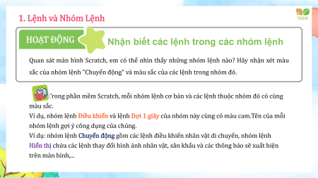 Trong phần mềm Scratch, mỗi nhóm lệnh cơ bản và các lệnh thuộc nhóm đó có cùng màu sắc.