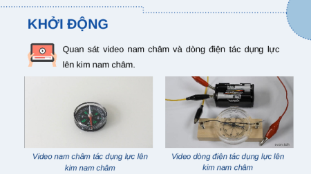 Quan sát video nam châm và dòng điện tác dụng lực lên kim nam châm.