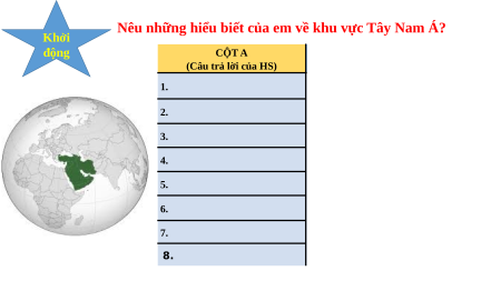 Nêu những hiểu biết của em về khu vực Tây Nam Á? Khởi động CỘT A NỐI CỘT B