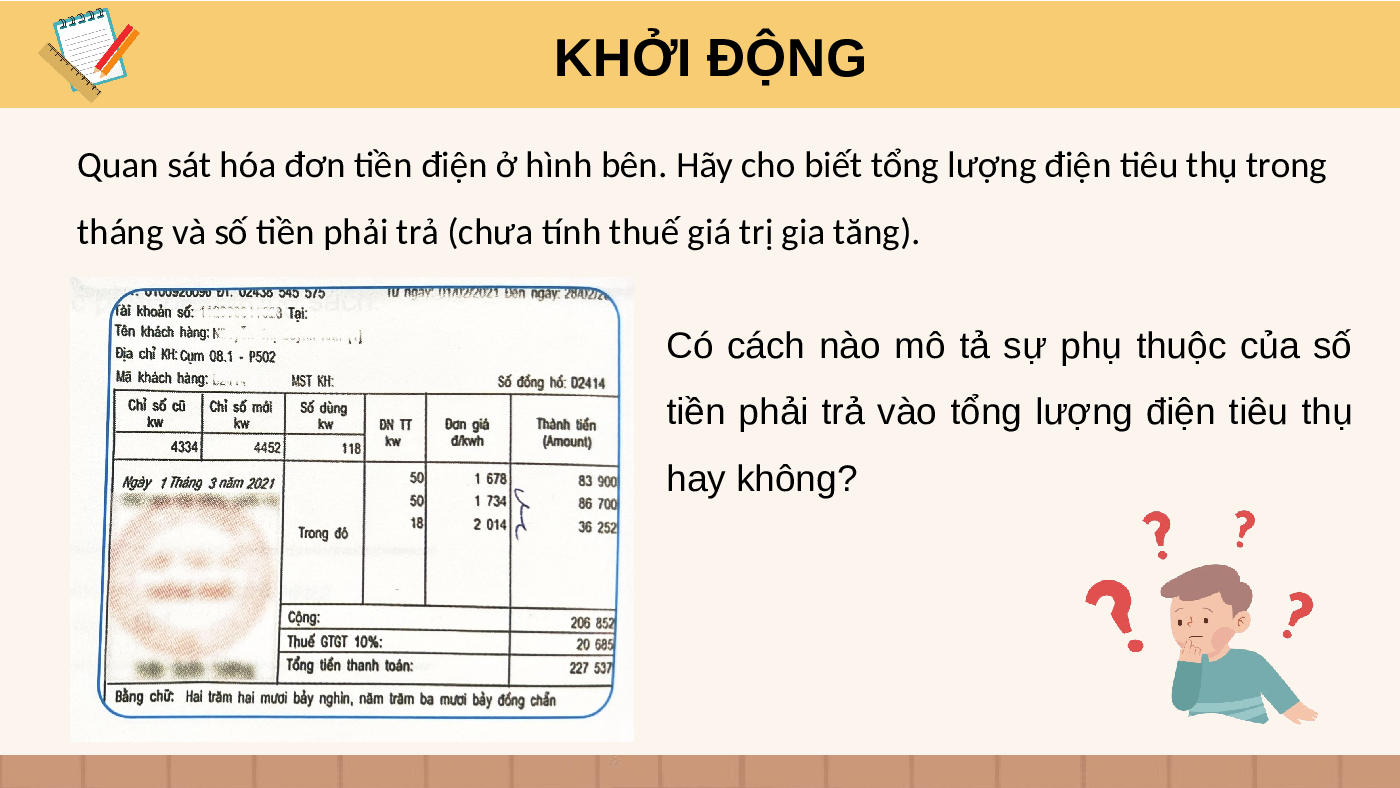 Quan sát hóa đơn tiền điện ở hình bên. Hãy cho biết tổng lượng điện tiêu thụ trong