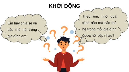 NHIỆT LIỆT CHÀO MỪNG CÁC EM ĐẾN VỚI BÀI HỌC MỚI! KHỞI ĐỘNG Theo em, nhờ quá Em hãy chia sẻ về trình nào mà các thế các thế hệ trong hệ trong mỗi gia đình gia đình em được nối tiếp nhau? BÀI 15