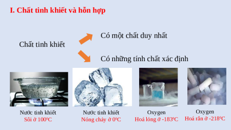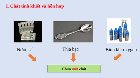 I. Chất tinh khiết và hỗn hợp Nước cất Thìa bạc Bình khí oxygen Chứa một chất
