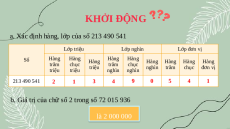a. Xác định hàng, lớp của số 213 490 541 Lớp triệu Lớp nghìn Lớp đơn vị Số Hàng Hàng Hàng Hàng Hàng Hàng Hàng Hàng Hàng trăm chục trăm chục triệu nghìn trăm chục đơn vị triệu triệu nghìn nghìn 213 490 541 2 1 3 4 9 0 5 4 1