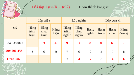Bài tập 1 (SGK – tr52) Hoàn thành bảng sau Lớp triệu Lớp nghìn Lớp đơn vị Số Hàng