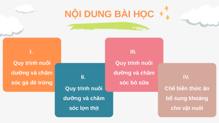 Bài 17: Nuôi dưỡng và chăm sóc vật nuôi NỘI DUNG BÀI HỌC I. III. Quy trình nuôi Quy trình nuôi dưỡng và chăm dưỡng và chăm II. IV. sóc gà đẻ trứng sóc bò sữa Quy trình nuôi