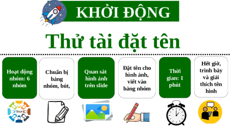 KHỞI ĐỘNG Thử tài đặt tên Hết giờ, Đặt tên cho Hoạt động Chuẩn bị Quan sát Thời trình bày hình ảnh, nhóm: 6 bảng hình ảnh gian: 1 và giải viết vào nhóm nhóm, bút, trên slide phút thích tên bảng nhóm hình Thử tài đặt tên BÀI 17