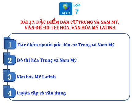Giáo án Powerpoint Bài 17 Địa lí 7 Chân trời sáng tạo: Đặc điểm dân cư Trung và Nam Mỹ, văn đề đô thị hoá, văn hoá Mỹ Latinh