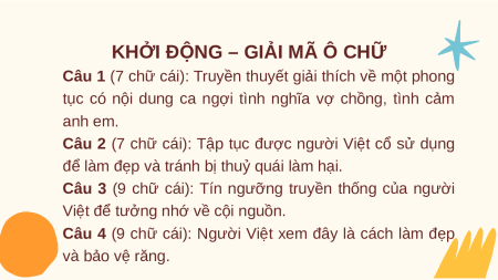 Câu 4 (9 chữ cái): Người Việt xem đây là cách làm đẹp và bảo vệ răng.