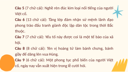 Câu 5 (7 chữ cái): Nghề rèn đúc kim loại nổi tiếng của người Việt cổ.