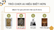 Câu 3: Tôn giáo phổ biến nhất của Ấn Độ là: A B C D Phật giáo Hin-đu giáo Đạo giáo Thiên chúa giáo
