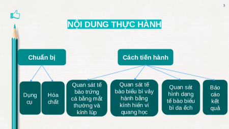 ✘ Em hãy cho biết sự sinh sản có ý nghĩa gì đối với sinh vật? 3 NỘI DUNG THỰC HÀNH Chuẩn bị Cách tiến hành Quan sát tế Quan sát tế Quan sát Báo bào trứng bào biểu bì vảy Dụng Hóa hình dạng cáo cá bằng mắt hành bằng cụ chất tế bào biểu kết thường và kính hiển vi bì da ếch quả kính lúp quang học