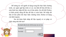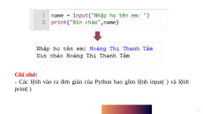 phím). Nội dung nhập có thể là số, biểu thức hay xâu và cho kết quả là một xâu kí tự. Cú pháp: = input() Ví dụ: 4