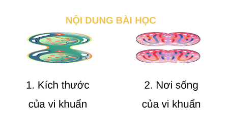 sạch hoặc để tiêu diệt vi khuẩn, vi trùng;... BÀI 18: VI KHUẨN XUNG QUANH CHÚNG TA (TIẾT 1) NỘI DUNG BÀI HỌC 1. Kích thước 2. Nơi sống của vi khuẩn của vi khuẩn