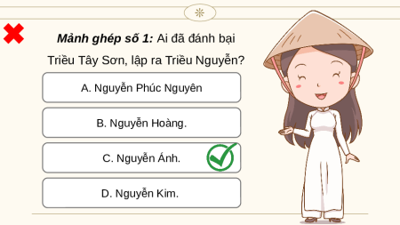 Triều Tây Sơn, lập ra Triều Nguyễn? A. Nguyễn Phúc Nguyên B. Nguyễn Hoàng. C. Nguyễn Ánh. D. Nguyễn Kim.