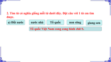 2. Tìm từ có nghĩa giống mỗi từ dưới đây. Đặt câu với 1 từ em tìm được. a) Đất nước nước nhà Tổ quốc non sông giang sơn