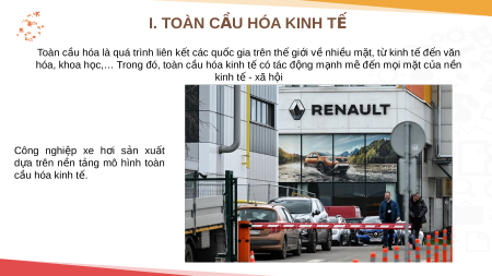Toàn cầu hóa là quá trình liên k t ế các qu c ố gia trên th ế gi i ớ v ề nhi u ề m t ặ , t ừ kinh t ế đ n ế văn hóa, khoa h c ọ ,… Trong đó, toàn c u ầ hóa kinh t ế có tác đ n ộ g m n ạ h m ẽ đ n ế m i ọ m t ặ c a ủ n n ề kinh t ế - xã h i ộ Công nghi p ệ xe h i ơ s n ả xu t ấ dựa trên n n ề t n ả g mô hình toàn c u ầ hóa kinh t . ế