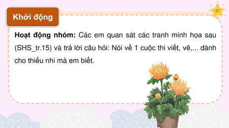 (SHS_tr.15) và trả lời câu hỏi: Nói về 1 cuộc thi viết, vẽ,... dành cho thiếu nhi mà em biết. Gợi ý