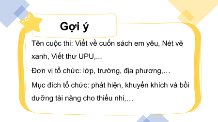 Tên cuộc thi: Viết về cuốn sách em yêu, Nét vẽ xanh, Viết thư UPU,...
