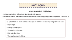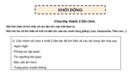 - Đội thứ hai sẽ tìm hiểu về một số dân tộc của các nước láng giềng ( Lào, Campuchia, Thái Lan,...)