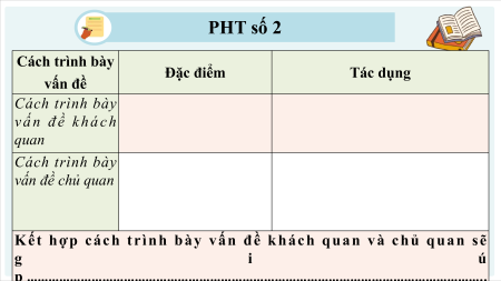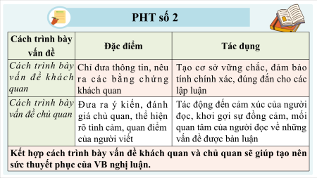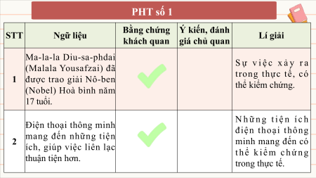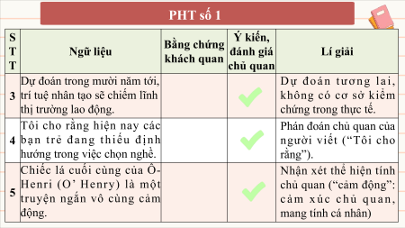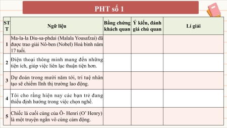 VB nghị luận, tìm ý chính và điền vào PHT số 2. PHT số 1 ST Ý kiến, đánh T Ngữ liệu Bằng chứng