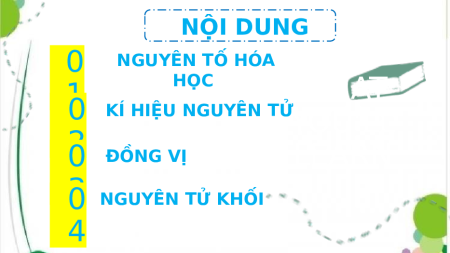 Bài 2: Nguyên tố Hóa học NỘI DUNG 0 NGUYÊN TỐ HÓA 1 HỌC WHAT 0 KÍ HIỆU NGUYÊN Y TỬ OU'LL 2 ĐỒNG VỊ 0 LEARN 3 NGUYÊN TỬ KHỐI 0 4