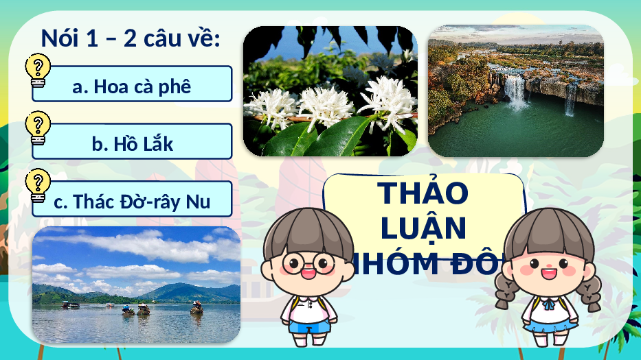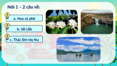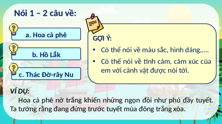 sức khỏe và chia sẻ một điều thú vị Nói 1 – 2 câu về cảnh đẹp Nói 1 – 2 câu về: a. Hoa cà phê b. Hồ Lắk c. Thác Đờ-rây Nu Nói 1 – 2 câu về: a. Hoa cà phê GỢI Ý: