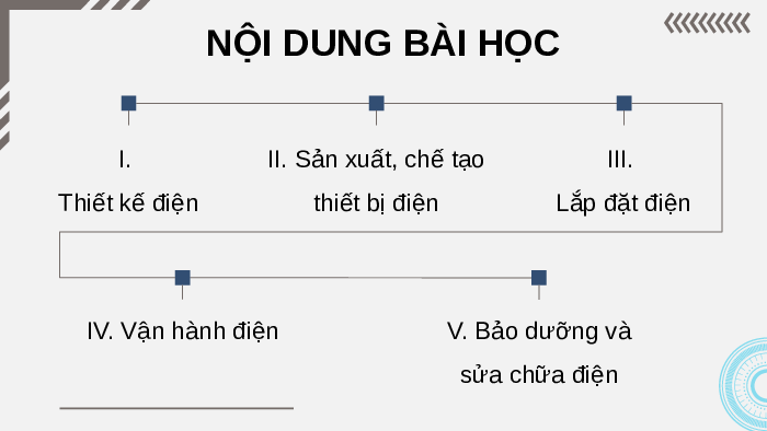 (sửa chữa mạch điện, đọc bản vẽ mạch điện). BÀI 2: NGÀNH NGHỀ TRONG LĨNH VỰC KĨ THUẬT ĐIỆN NỘI DUNG BÀI HỌC I. II. Sản xuất, chế tạo III. Thiết kế điện thiết bị điện Lắp đặt điện IV. Vận hành điện V. Bảo dưỡng và sửa chữa điện
