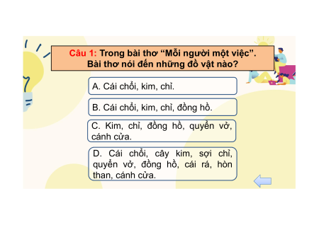 Câu 1: Trong bài thơ “Mỗi người một việc”.