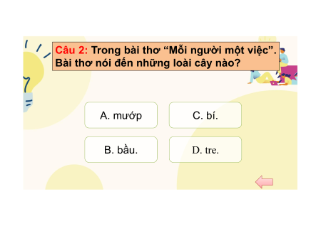 Câu 2: Trong bài thơ “Mỗi người một việc”.