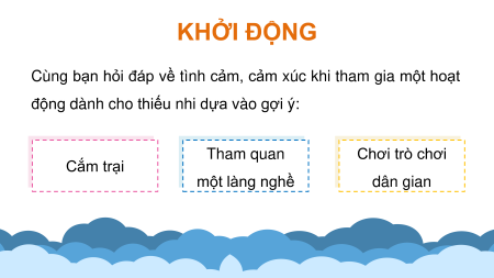 động dành cho thiếu nhi dựa vào gợi ý: Tham quan Chơi trò chơi Cắm trại một làng nghề dân gian KHỞI ĐỘNG
