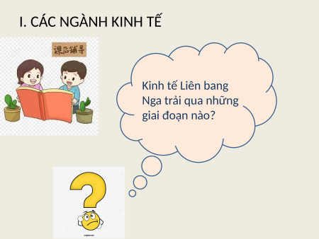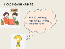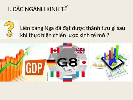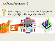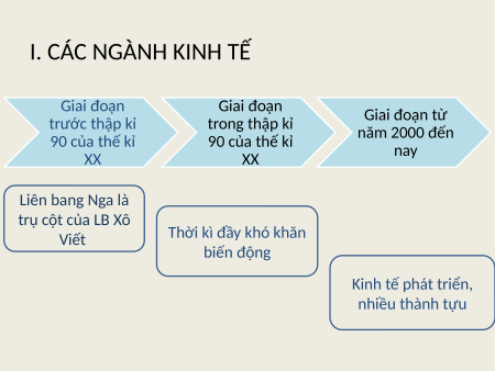 KINH TẾ LIÊN BANG NGA NỘI DUNG BÀI HỌC CÁC CÁC NGÀNH VÙNG KINH TẾ KINH TẾ KINH TẾ I. CÁC NGÀNH KINH TẾ Kinh tế Liên bang Nga trải qua những giai đoạn nào? I. CÁC NGÀNH KINH TẾ Giai đoạn Giai đoạn trước thập kỉ trong thập kỉ Giai đoạn từ 90 của thế kỉ 90 của thế kỉ năm 2000 đến XX XX nay Liên bang Nga là trụ cột của LB Xô Viết Thời kì đầy khó khăn biến động Kinh tế phát triển, nhiều thành tựu