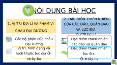 CỦA CÁC ĐẢO, QUẦN ĐẢO CHÂU ĐẠI DƯƠNG VÀ LỤC ĐỊA Ô-XTRÂY-LIA Các bộ phận của châu Đặc điểm thiên nhiên Đại Dương các đảo và quần đảo Vị trí, hình dạng và Đặc điểm thiên nhiên